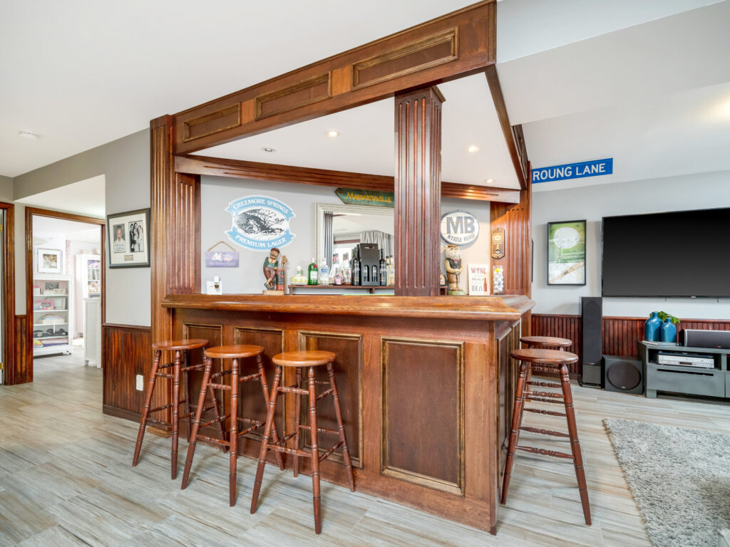 The allure of this home extends to its lower level, where an expansive recreation room awaits. This space is a haven for entertainment, featuring a custom bar that is sure to be the centerpiece of your gatherings. Additionally, the lower level houses two more bedrooms and a well-appointed four-piece bathroom, offering ample space for family and guests.
